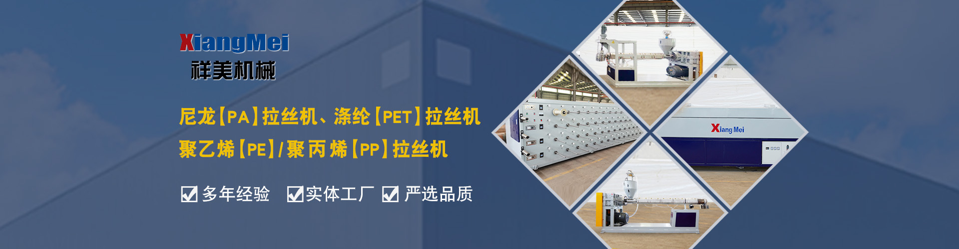 我公司是一家具有30多年專業生產塑料拉絲機的企業,作為國內最早生產圓絲塑料拉絲設備的企業,成為國內同行競相爭仿的標桿,公司產品主要可以生產聚乙烯(PE)、尼龍(PA)、聚丙烯(PP)、滌綸(PET)等作原料拉絲機設備及其配套設備、鉛芯機設備及其配套設備,拉絲機設備主要生產的產品有單絲、復絲、扁絲、刷絲、草坪絲、拉鏈絲、割草線等各類線絲,公司產品在國內同行業中性價比高、有良好的口碑,曾獲“國家高新技術、新產品博覽會金獎”被輕工部定位替代進口產品、國家級新產品,并多次獲得省、市科技進步獎,產品遍布全國大部分地區,并遠銷日本、意大利、俄羅斯、韓國、印度、澳大利亞、印度尼西亞、墨西哥、菲律賓、泰國、朝鮮、巴基斯坦、烏茲別克斯坦、越南、馬來西亞、老撾、越南、坦桑尼亞等國家和地區。 公司實行現代化企業管理,始終秉承以科技為先導,制造為基礎,管理為核心的企業面貌,運用先進的生產設備,創新的思維理念,確保產品多樣化、系列化,高品質,把誠信、責任、創新作為祥美人不斷的追求的目標,為新老客戶打造高品質的拉絲設備。 公司位于黃海之濱、亞歐大陸橋東橋頭堡的海濱城市——連云港,這有海陸空便捷的交通網絡、風景秀麗的山海風光,總經理江中堯先生攜公司全體員工竭誠歡迎各界人士、中外新老客戶來連洽談業務。